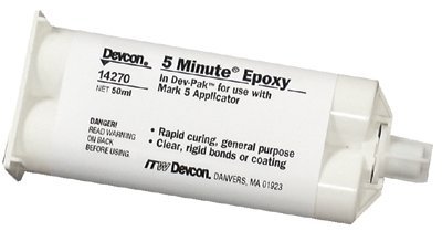 - Product Name: Devcon 5 Minute Amber Two-Part Epoxy Adhesive - Amber, Base & Accelerator (B/A) - 50 ml Cartridge - Shore Hardness 85 Shore D, Shear Strength 1900 psi [PRICE is per CARTRIDGE]